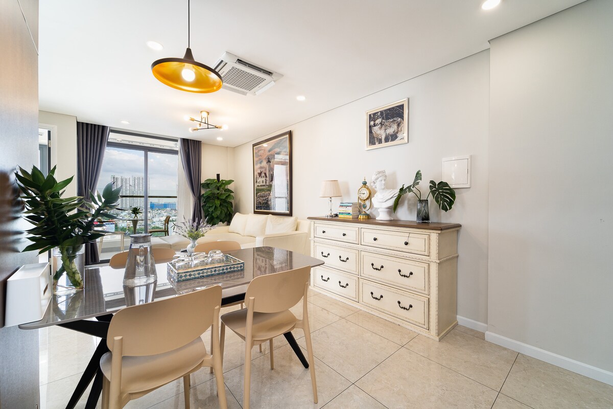 ¡Bienvenido a tu oasis urbano! Relájate en nuestro apartamento de 1 dormitorio para 2 personas con un balcón con vistas panorámicas en Japan Town, a solo 5 minutos del centro de HCM. Restaurantes, bares, cafés, lugares para masajes y tiendas de conveniencia están a 1-200 m a pie. En el tercer piso, tu paraíso en Japandi tiene todas las comodidades. No hay ascensor, ¡pero las amplias y suaves escaleras son un entrenamiento gratuito! 💪 Disfruta de un proyector de 100 pulgadas para las noches de cine, un acogedor sofá de 1,8 metros, una cocina totalmente equipada y un baño refrescante.