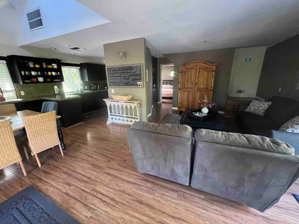 550 pies cuadrados en la unidad de derecho con entrada principal propia, baño, cocina completa, 1 dormitorio con cama tamaño queen y sala de estar con sofá cama (queen), TV e Internet de alta velocidad. ¿Quieres cocinar tus propias comidas? ¡No hay problema! Cocina completa con microondas, 2 neveras: una pequeña de 4 pies cúbicos y una más grande de 7,5 pies cúbicos (perfecta para estancias más largas), utensilios y ollas. Combinación de lavadora/secadora. A 7 minutos del Thunder Valley Casino y muy cerca de la autopista 65 y muchas tiendas. Permiso de la ciudad de Rocklin: STR2025-0005