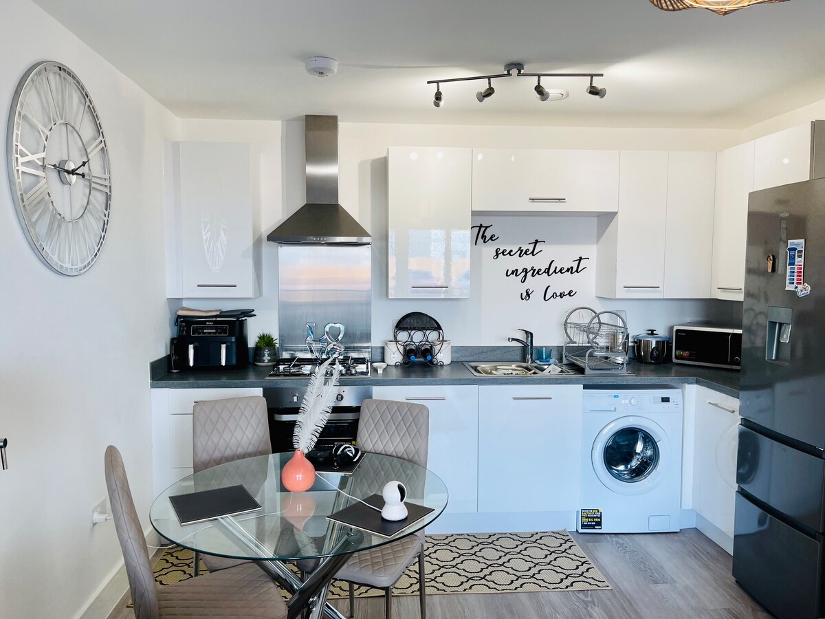 Disfruta de una estancia elegante y cómoda en esta casa entera, perfecta tanto para visitas cortas como largas. - Ubicado a solo 5 minutos a pie de la estación de Chafford Hundred. - A 10 minutos del centro comercial Lakeside. - Centro de Londres a solo 40 minutos en tren. Tiene capacidad para 4 personas y cuenta con un espacio de oficina dedicado para el trabajo a distancia, una cocina totalmente equipada, un amplio jardín y servicios como Netflix y una máquina de café para que te sientas como en casa.