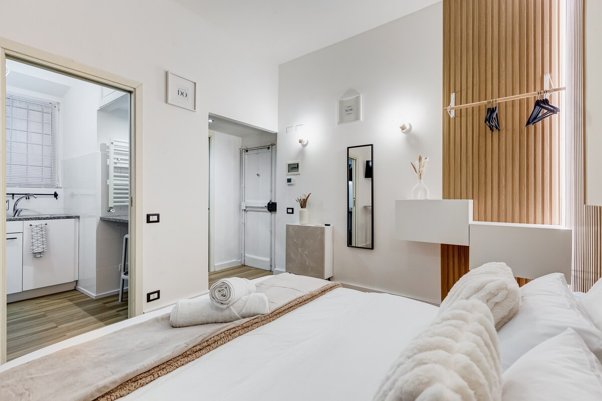 Precioso apartamento en Piazza San Giovanni, en el centro de Roma, es posible llegar en 10/15 minutos a lugares históricos y monumentos como el Coliseo, Fori Imperiali, Piazza Venezia. La casa está situada en el segundo piso de un edificio elegante y moderno, la casa se compone de sala de estar con zona de cocina, sofá cama, dormitorio, baño con ducha grande y una hermosa terraza. El entorno se caracteriza por la elegancia, la atención al detalle y el estilo funcional moderno/vintage.