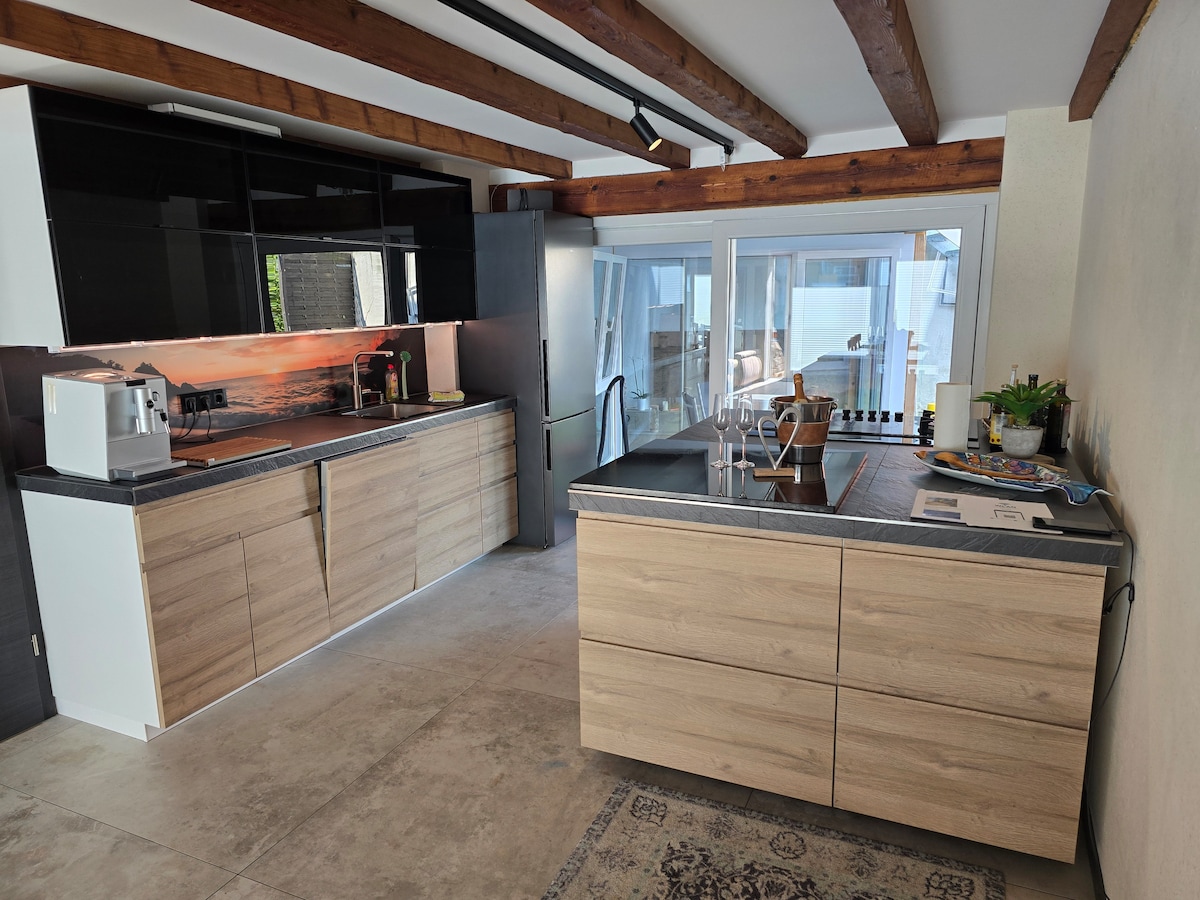 Moderna casa de madera de diseño con impresionantes vistas al viñedo y a la valle del Rems. El apartamento está situado en la planta baja de una casa unifamiliar y tiene una entrada independiente desde el exterior. A 15 minutos en coche de Stuttgart Mitte y a 20 minutos en tren suburbano. El alojamiento El apartamento dispone de un equipamiento de alta calidad. Cocina abierta, sala de estar y comedor. Una terraza exterior muy grande te invita a quedarte. Todos los equipamientos del apartamento están disponibles