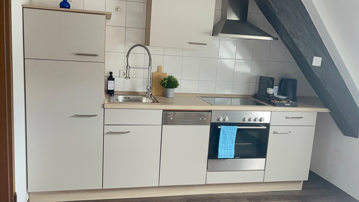 Moderno oasis en el ático en el centro de Friolzheim, tranquilo y céntrico entre Stuttgart y la Selva Negra. Cerca: gimnasio, panadería, tiendas. Sala de estar inundada de luz con sofá de esquina, mesa de comedor y televisor inteligente. Cocina totalmente equipada: estufa de inducción, horno, microondas, cafetera. Acogedora habitación con cama de 180 cm con somier; cama adicional de 160 cm en el ático. Baño moderno con ducha. Aspectos destacados: wifi, estacionamiento, lavadora. Ideal para parejas que viajan solas o viajes de negocios.