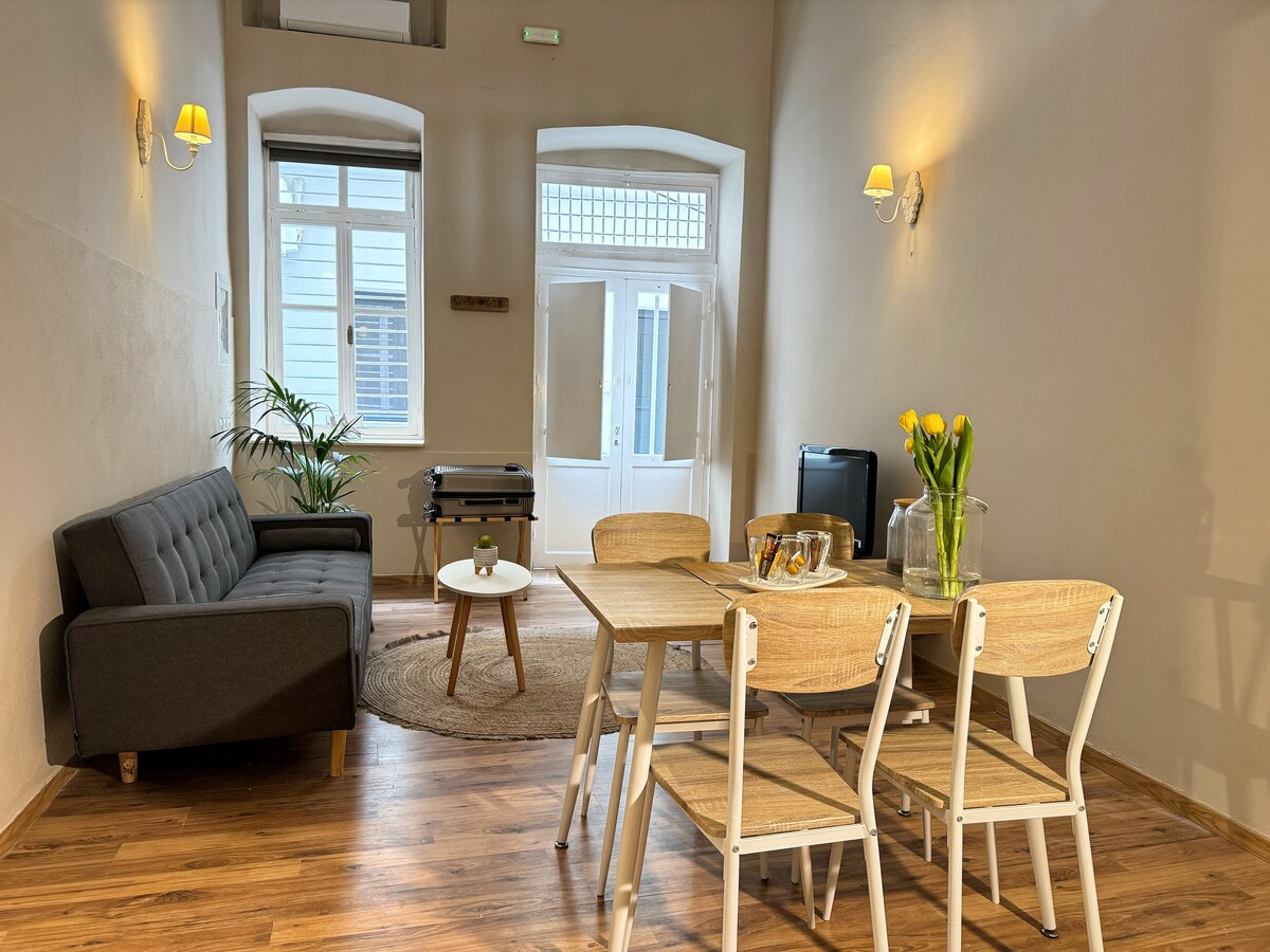 Apartamento de un dormitorio totalmente equipado con vistas frontales al mar. Una cama doble en el dormitorio y 1 sofá cama en el salón, cocina totalmente equipada (horno, nevera-congelador, lavavajillas, 4 fogones), baño con ducha, lavadora, terraza privada con sillas y mesa. Acceso a un patio compartido con acceso directo al mar (rocas) donde los huéspedes pueden darse un baño por la mañana. Vistas frontales al mar desde la sala de estar y el dormitorio. A pocos pasos del centro de Ermoupolis.