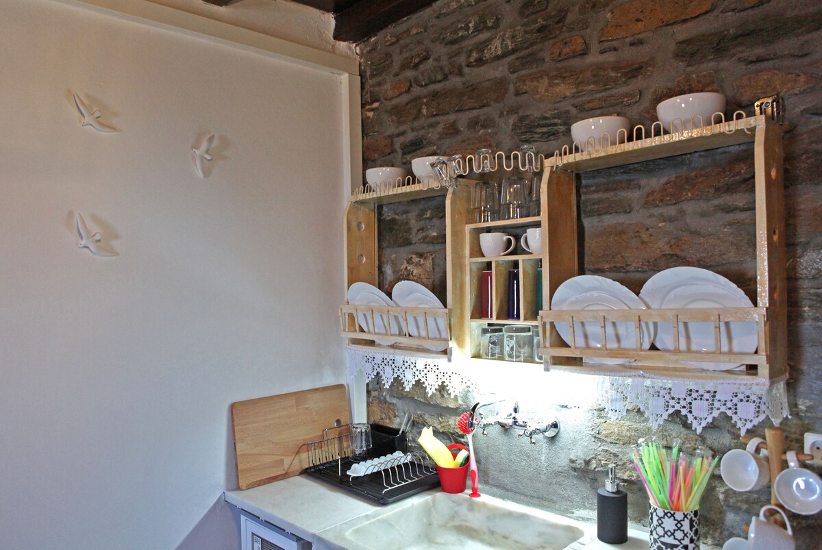 Una casa de huéspedes de piedra de 20 m2 en la ubicación Deli, en la colina de la Resurrección. Vistas de las islas circundantes (Tinos, Miconos, Paros) y el puerto de Ermoupoli. Tiene sofá cama; para enfriar tiene ventilador de techo y aire acondicionado. La cocina incluye nevera, estufa y horno para cocinar, cafetera de filtro, tostador y todos los utensilios necesarios. Tiene wifi y televisión. Perfecto para disfrutar del amanecer y la luna de la noche.