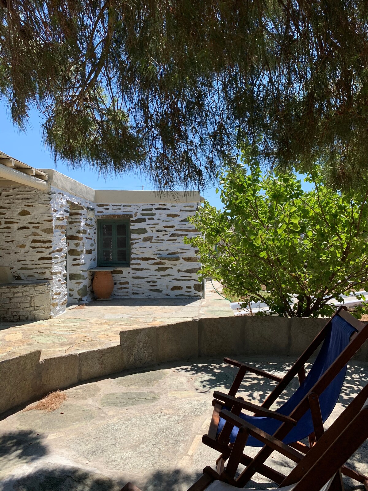 Ubicada en un exuberante jardín a solo 200 metros del mar, esta acogedora casa de piedra ofrece el refugio perfecto para dos huéspedes, ideal para una pareja que busca tranquilidad y el encanto de la isla. El interior cuenta con una cama doble y una cama individual dentro del mismo espacio abierto, así como una cocina compacta equipada con nevera. Sal al tranquilo patio, protegido del viento y del sol, donde podrás relajarte en la hamaca bajo la sombra de un árbol. Hay estacionamiento privado disponible en la propiedad.