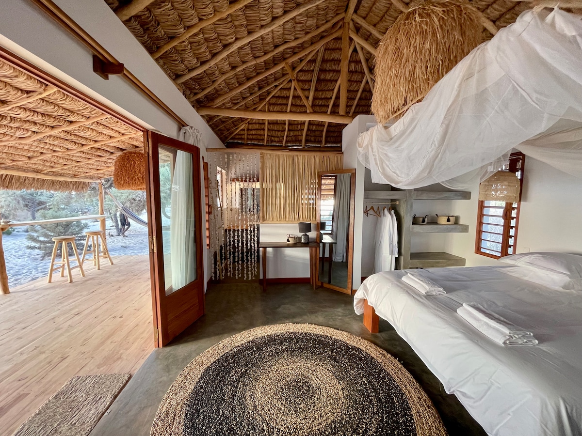 ¡¡Disfrute del lujo excepcional de este alojamiento único!! Un lugar donde reina la dulzura de la vida, marcada por el solo vaivén de las canoas de los percán Vezos, sus velas multicolores resbaladizas sobre el océano. 8 hectáreas de dunas por 500 metros de playa. Bienvenido al paraíso… La tarifa incluye la cabaña para dos personas y las pensiones completas