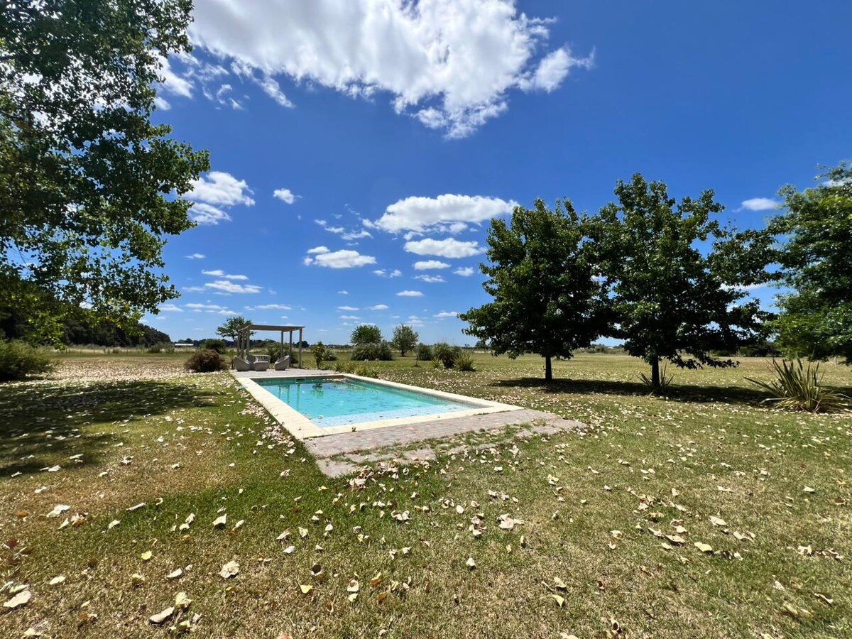 No se permiten reuniones ni eventos. Capacidad máxima del lugar es hasta 4 personas. Se respira aire de campo, naturaleza, vida sana y un descanso pleno. Viví tu experiencia... . Wifi • Fogón • Parrilla • Piscina • Smart Tv • Split F/C en todos los ambientes • Vajilla Completa • Lavavajillas • Pequeños Electrodomésticos varios • Lavarropas • Las 2 habitaciones c/ cama matrimonial • 2 baños completos 1 Toilette •