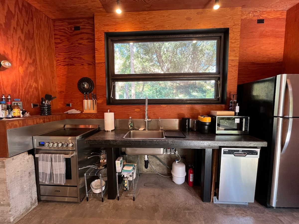 Como se destaca en los '10 mejores Airbnbs cerca de Los Ángeles' de Time Out, nuestra galardonada cabaña ofrece una auténtica estética escandinava y un diseño espacial inteligente y ergonómico, todo ubicado dentro de un entorno de cañón. Una ventana de cristal con marco en A enmarca la escena: vistas ininterrumpidas a través de Topanga que infunden una sensación de paz. Esta es una experiencia de «retiro» que (con suerte) recordarás. Un espacio relajante para descomprimir, leer y desconectar.