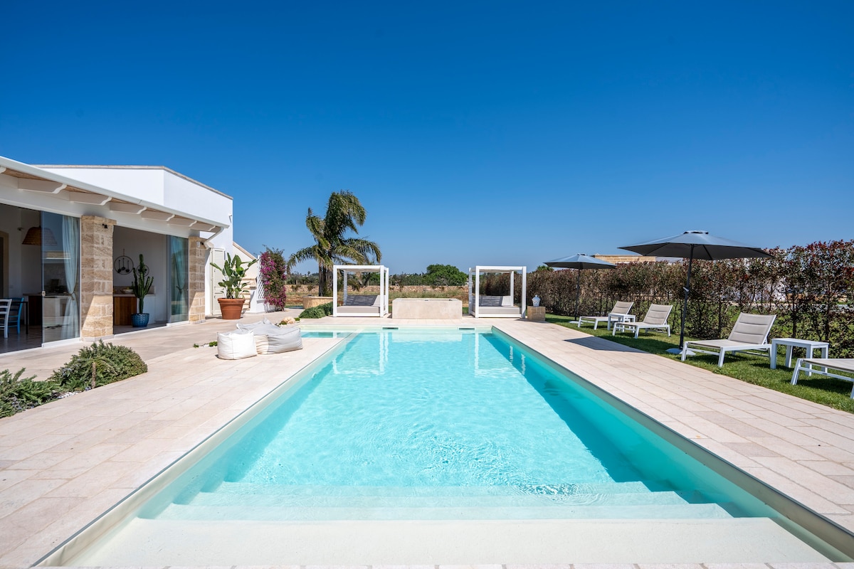 Villa Lucia es el lugar donde un grupo de amigos o una familia numerosa deja de hacer concesiones: 250m² de villa privada, una dependencia independiente, piscina, jacuzzi y un porche acristalado de 100m² donde uno acaba pasando la mitad de la estancia sin darse cuenta. Hasta 8 personas, cada una con su espacio. El Salento está al otro lado de la puerta — sus calas, la campiña y el barroco de Lecce. Pero quien se hospeda en Villa Lucia descubre que siempre hay una razón para quedarse un poco más.
