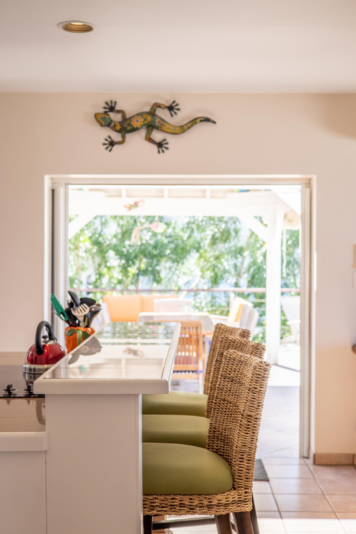 Relájate y desconecta en este tranquilo apartamento de un dormitorio de estilo playero. Te enamorarás de este espacio único desde el momento en que aparques en el lugar y camines por el camino de piedra iluminado hasta tu entrada privada. Las renovaciones completas se terminaron en 2022 e incluyen 2 unidades de aire acondicionado, una cocina completa, sala de estar, comedor interior y exterior, dormitorio privado, ducha extragrande con cabezal de ducha de efecto lluvia, múltiples sistemas de filtración de agua + sistema UV y mucho más. Todo el mundo disfrutará de «Takin' it Breezy» y se sentirá como en casa.