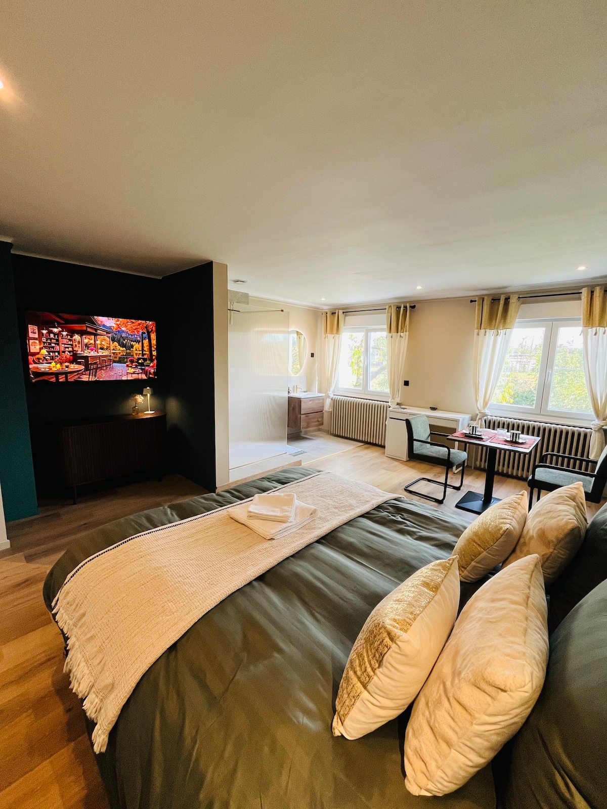 The studio is located in the Pays des Collines region and very close to the Pairy Daiza park. The accommodation is completely independent of our home, very quiet. On the ground floor: a 16m² bathroom with shower, washbasin, WC. Upstairs: 35 m² with a bedroom area, a lounge area, (fridge, microwave, Nespresso, sink, dishes.) TV and internet. Bed linen and towels available. Eco-friendly air conditioning is powered by a heat pump.