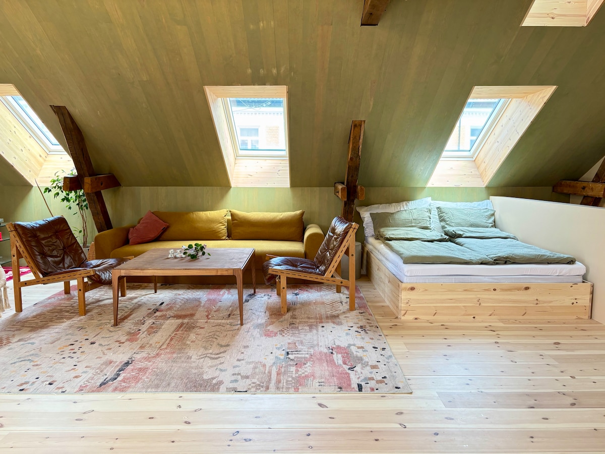 Un estudio atmosférico con un gran balcón, en el centro de la ciudad, con un ambiente cálido y tranquilo en colores oscuros. Aquí vives en una casa con personalidad, no en una habitación de hotel ordinaria. Todo está a poca distancia: tiendas de comestibles, restaurantes, bares, farmacias y parques verdes. El transporte público es fácilmente accesible y la vida de la ciudad está a la vuelta de la esquina. Perfecto para aquellos que quieren alojarse en el centro, cómodamente y de una manera un poco diferente. Te espera un ambiente único y una sensación acogedora y hogareña.