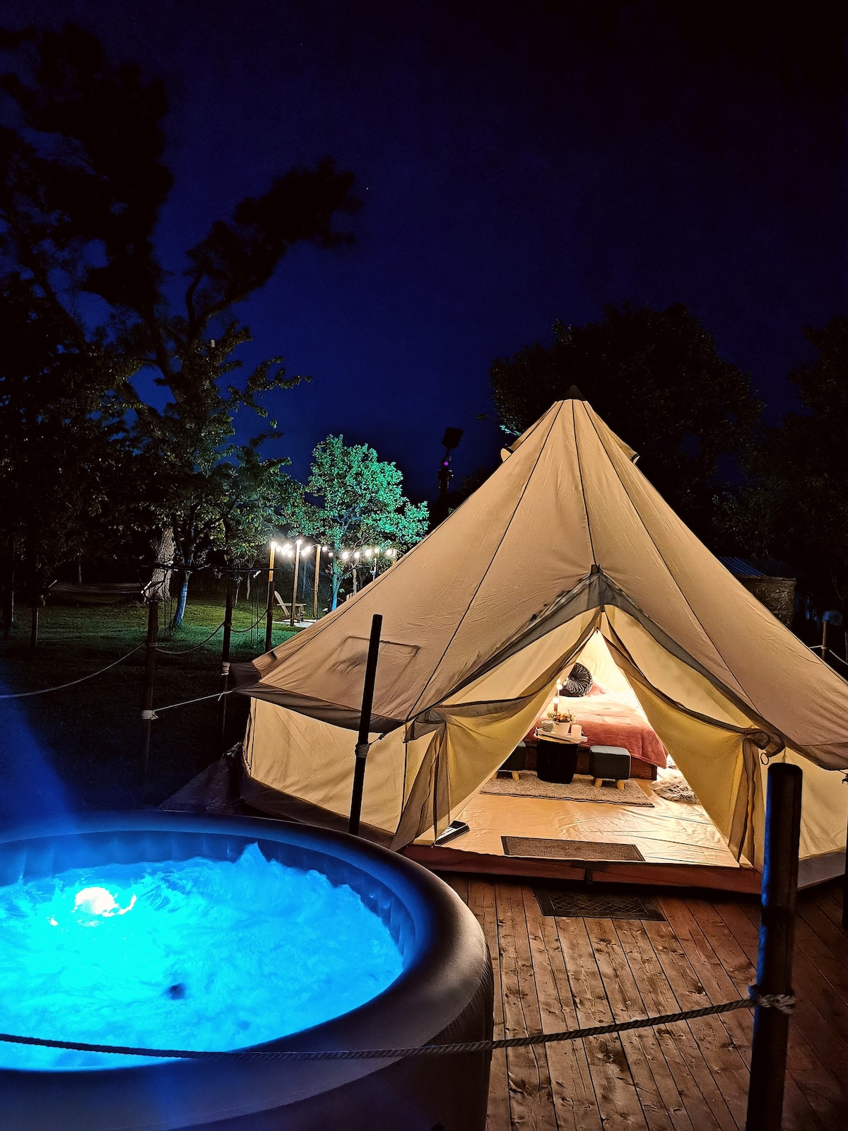 Glamping-ul imbina intr-un mod deosebit atmosfera boema a cortului cu facilitatile oferite de cazarile traditionale. Nimic nu poate inlocui emotia trezirilor in zori inconjurati de verdeata. Nici un fel de cazare nu se compara cu acesta. Libertarea si confortul…adormi cu cantecul greierilor si te trezesti cu cantecul pasarilor. Serile sunt magice langa focul semineului pentru gradina acompaniat de ghirlandele luminoase iar muzica ambientala completeaza o seara de poveste!