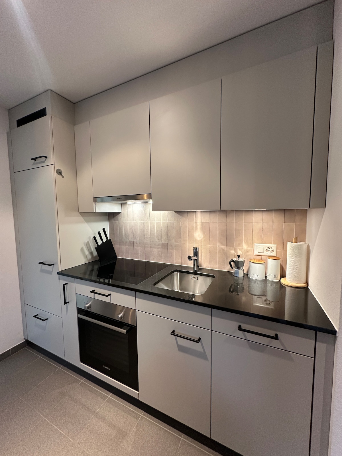 Habitación con terraza amplia. Cocina: cocina totalmente equipada con lavavajillas, placa de cocción, microondas, horno y cafetera. Las bebidas se proporcionan de forma gratuita. -Sala de estar: sofá cama. Wifi gratuito, gran Smart TV -Cuarto de baño: espacioso inodoro con ducha y espejo grande. -Iluminación: iluminación LED ambiental La habitación te ofrece la combinación perfecta de confort y relajación con un estilo propio. Ideal para parejas (+ niño), personas que viajan solas o viajeros de negocios