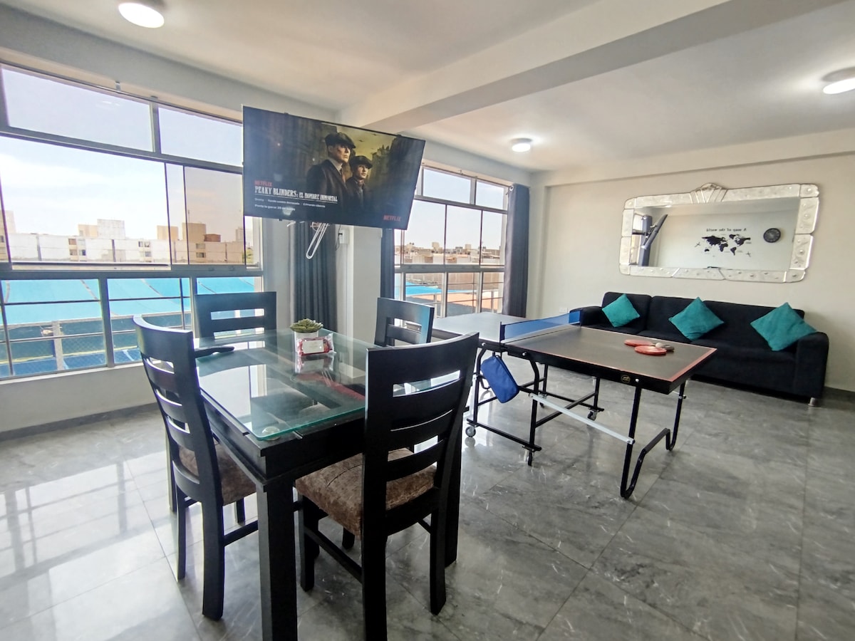 Departamento amplio con 115 m2 , elegante alojamiento con sala comedor y cocina americana de concepto abierto, es ideal para viajes en familia y por negocios, totalmente equipado para corta o larga estadía, esta ubicado en piso superior con potente iluminación natural y ventilación, con espacio para juego de niños. ( hay servicio de early check in y late check out con un valor adicional, segun disponibilidad )