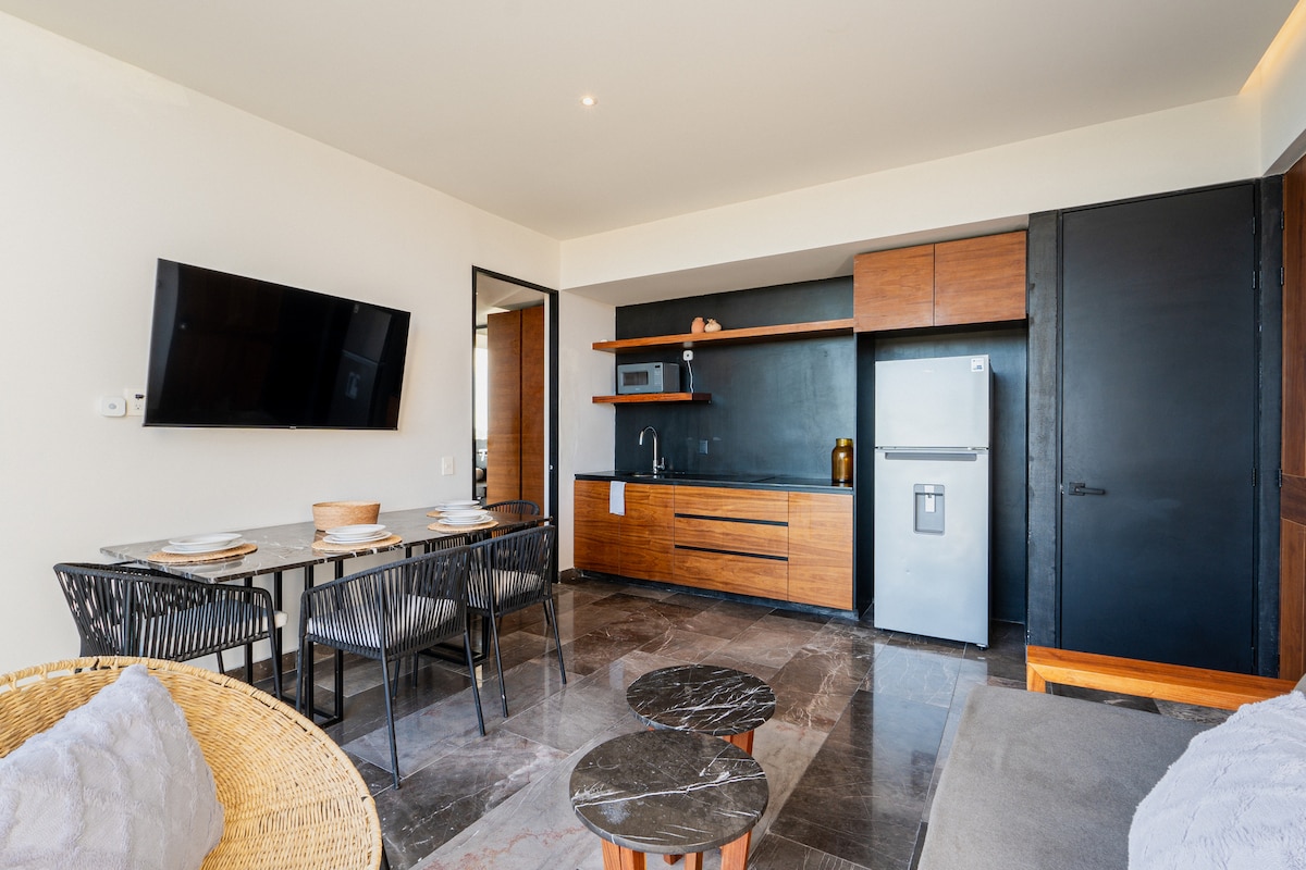 Your vacation home away from home; ideal for couples, digital nomads or solo travelers. With fast internet, bedroom with king bed, A/C unit, kitchenette & balcony plunge pool. You will have access to incredible common areas such roof top pool, Jacuzzis, and much more. One of the most convenient locations you will be within walking distance to some of the best restaurants, shops and supermarket; and closeto the beach.. You will have everything you need to live the Tulum experience.