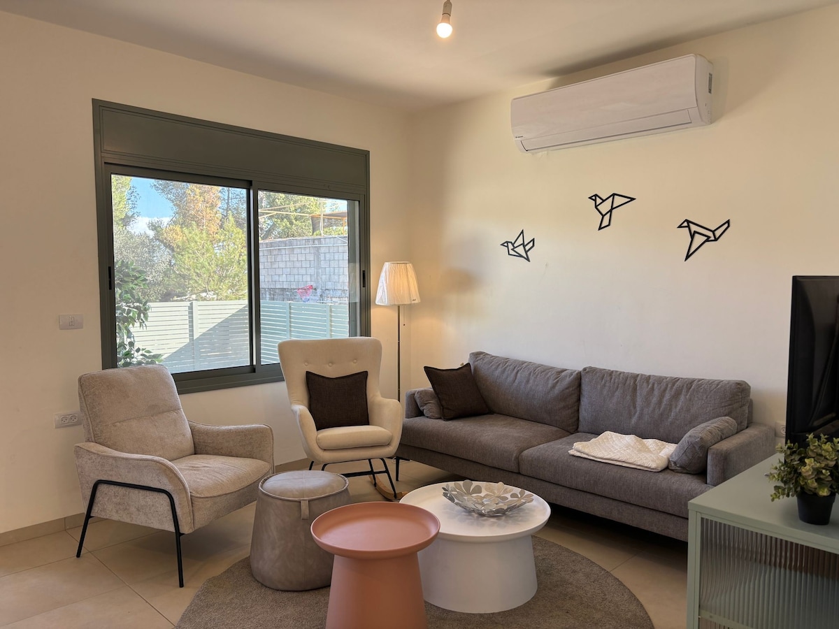 Un lugar espacioso adecuado para familias, con mucho espacio para pasar tiempo juntos. La casa tiene 2 dormitorios con una cama doble (dormitorio principal 190/160 * colchón de cama baja * * habitación de invitados 190/140) y otro dormitorio para niños con una cama individual y 2 colchones individuales. Existe la posibilidad de agregar un colchón individual en el dormitorio principal y una cuna para acampar. La casa tiene un gran espacio central con una cocina cómoda y totalmente equipada y muchas zonas de estar alrededor y fuera de la casa. Hay una gran terraza con vistas a las montañas con una zona de barbacoa, un gran césped y un trampolín. La casa está a poca distancia del arroyo dentro del kibutz y en temporada hay una opción para ingresar a la piscina kibutz por una tarifa en la entrada.