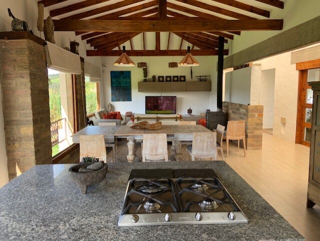 La casa tiene un bello diseño arquitectónico, es cómoda, acogedora, con espacios para el teletrabajo y está muy bien equipada. Es tibia y muy iluminada. Tiene bellos jardines y una vista maravillosa a las montañas. Ideal para amantes de la naturaleza. El clima es agradable y poco lluvioso. Tiene Wi-Fi, TV por cable y agua caliente. A 12 minutos del pueblo en carro y cerca de las principales atracciones de la Villa: Pozos azules, Granja de las avestruces, Infiernito y Parque de los Dinosaurios.