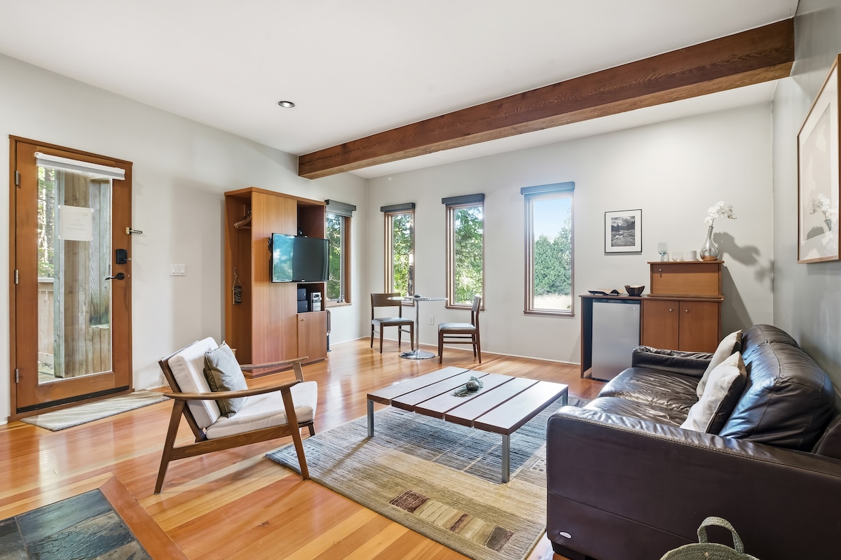 Muy cómoda suite de un dormitorio en alquiler. Con una ubicación céntrica en la hermosa Ucluelet, está a poca distancia a pie de la ciudad, rutas de senderismo y hermosas playas locales. Relájate en la bañera de hidromasaje para completar tu día de aventuras. Muy adecuada para parejas o familias con niños. La suite está unida a nuestra casa familiar. La suite es generalmente bastante tranquila y hacemos todo lo posible por limitar el sonido, pero es posible que a veces escuches sonidos de la sala de estar de abajo.