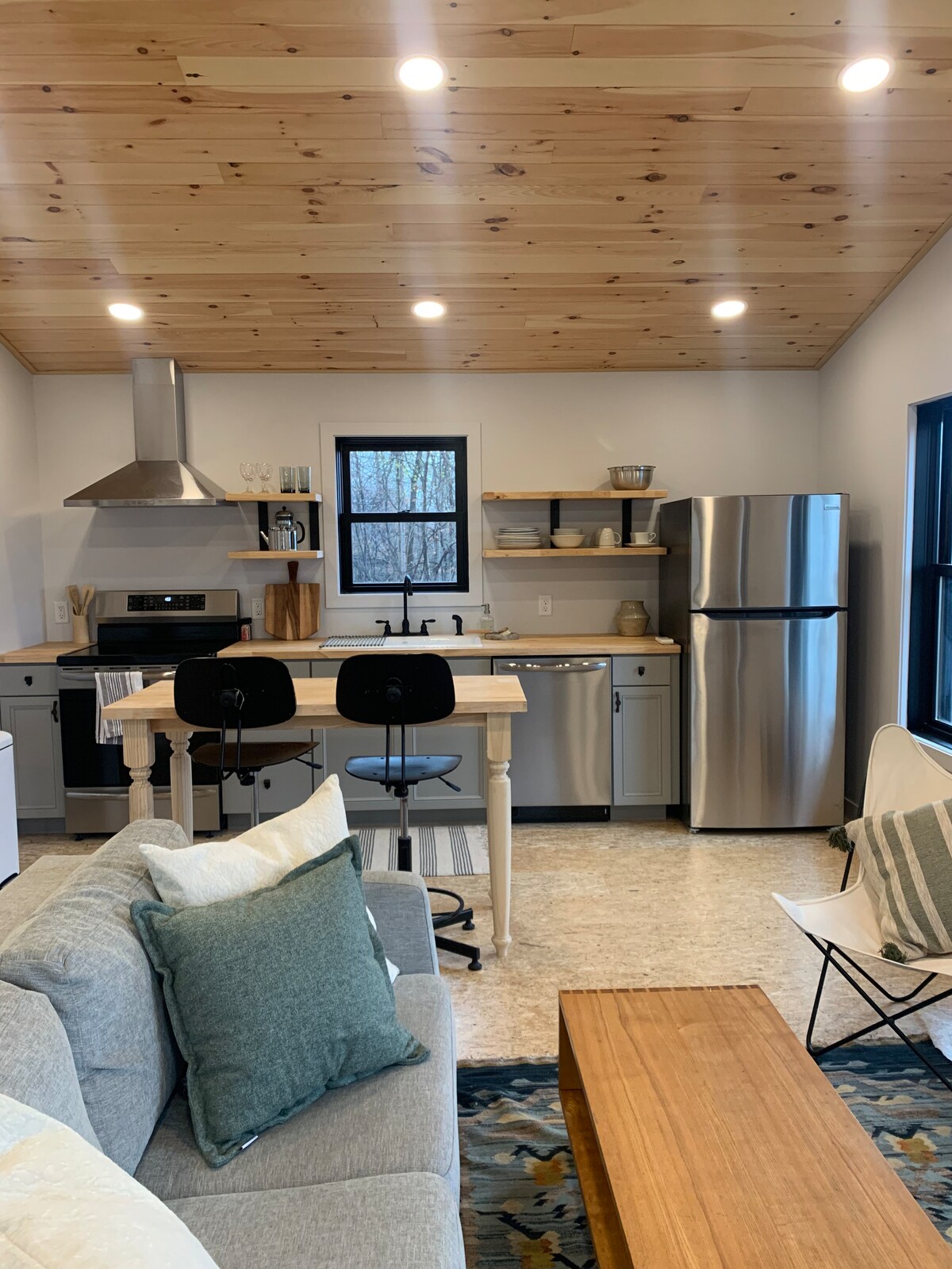 Ambiente industrial en un entorno rural. Esta casa de 3 dormitorios y 2 baños es nueva y está diseñada profesionalmente. La casa cuenta con una cocina nueva, TV de 65 pulgadas en la sala de estar, camas cómodas y dos estaciones de trabajo desde casa con monitores dobles. Se admiten perros, pero no se pueden alojar gatos u otras mascotas. *Nuestra casa de nueva construcción es la mitad de un dúplex al lado. Cada casa es extremadamente tranquila y tiene un espacio interior y exterior totalmente privado para que aproveches al máximo tu escapada rural.