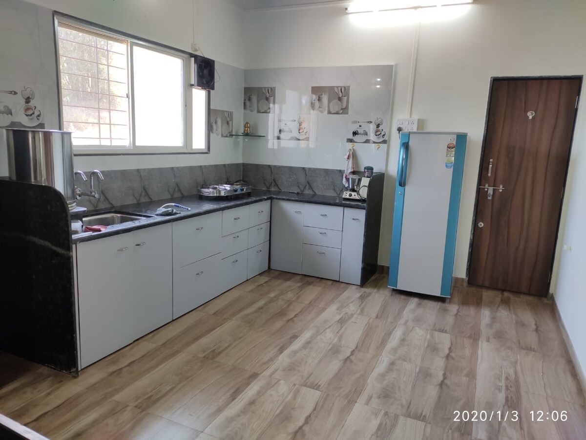 Experience your perfect getaway at our luxurious 3BHK homestay in Sangamnagar, Satara. Located in the posh Sinhagad, Adarsha Vishwa CHS— just 7.5 km from Satara Railway Station— this premium stay is ideal for families, couples, and business travellers. Enjoy spacious bedrooms with scenic balconies, a cozy living room, modular kitchen and serene countryside views. With airy interiors and secure parking, it’s where comfort meets elegance.