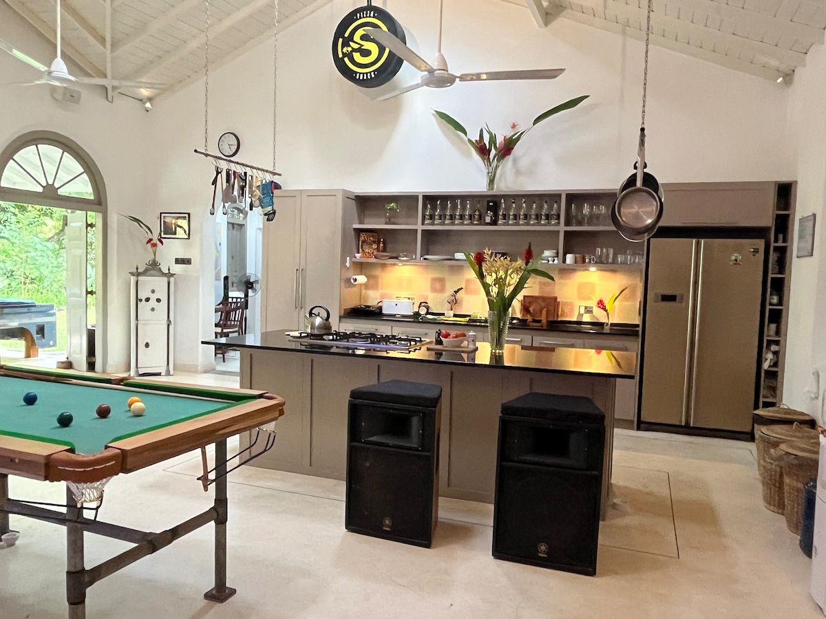 Grand airy villa set in 4 acres with 4 dogs, 2 rabbits, 2 cows & a cat. Perfect spot to relax and let our team take care of you: they will cook to your specifications & ensure you have everything you need. Sit beside the pool with a cold drink keeping one eye open for the occasional monkey, peacocks & tropical birds who also like to visit. Play pool, table football, darts or Volleyball. The house & bedrooms are comfortable and beautiful. Sound system & cinema projector will not disappoint.
