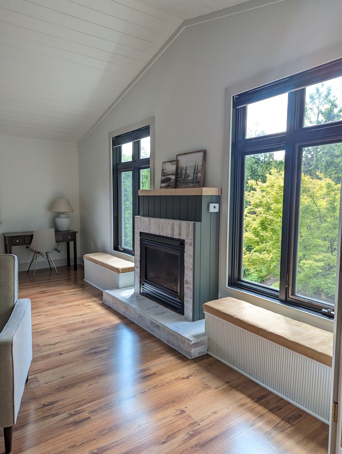 Cabaña en el río con chimenea, kayaks y bicicletas
