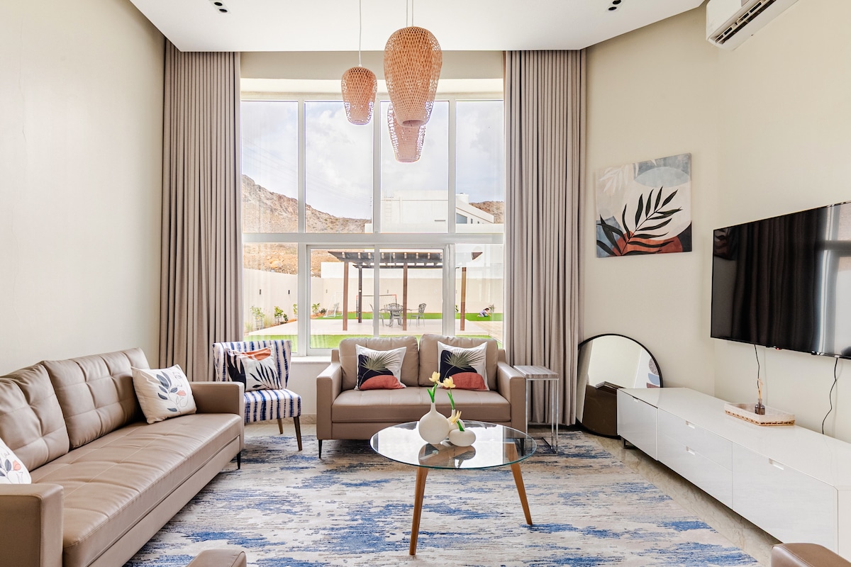 Una casa de campo moderna de estilo europeo con vistas panorámicas a las montañas y a la naturaleza tranquila. Una experiencia rural única en los Emiratos. Nos esforzamos por ofrecer una hospitalidad hotelera excepcional y hacer que te sientas como en casa. Disfruta de la tranquilidad rodeado de montañas y naturaleza, lejos del ajetreo y el bullicio de la ciudad. Esta hermosa casa de campo reúne a familiares y amigos, ofreciendo un ambiente inspirador que se siente como si estuvieras en los Alpes suizos.