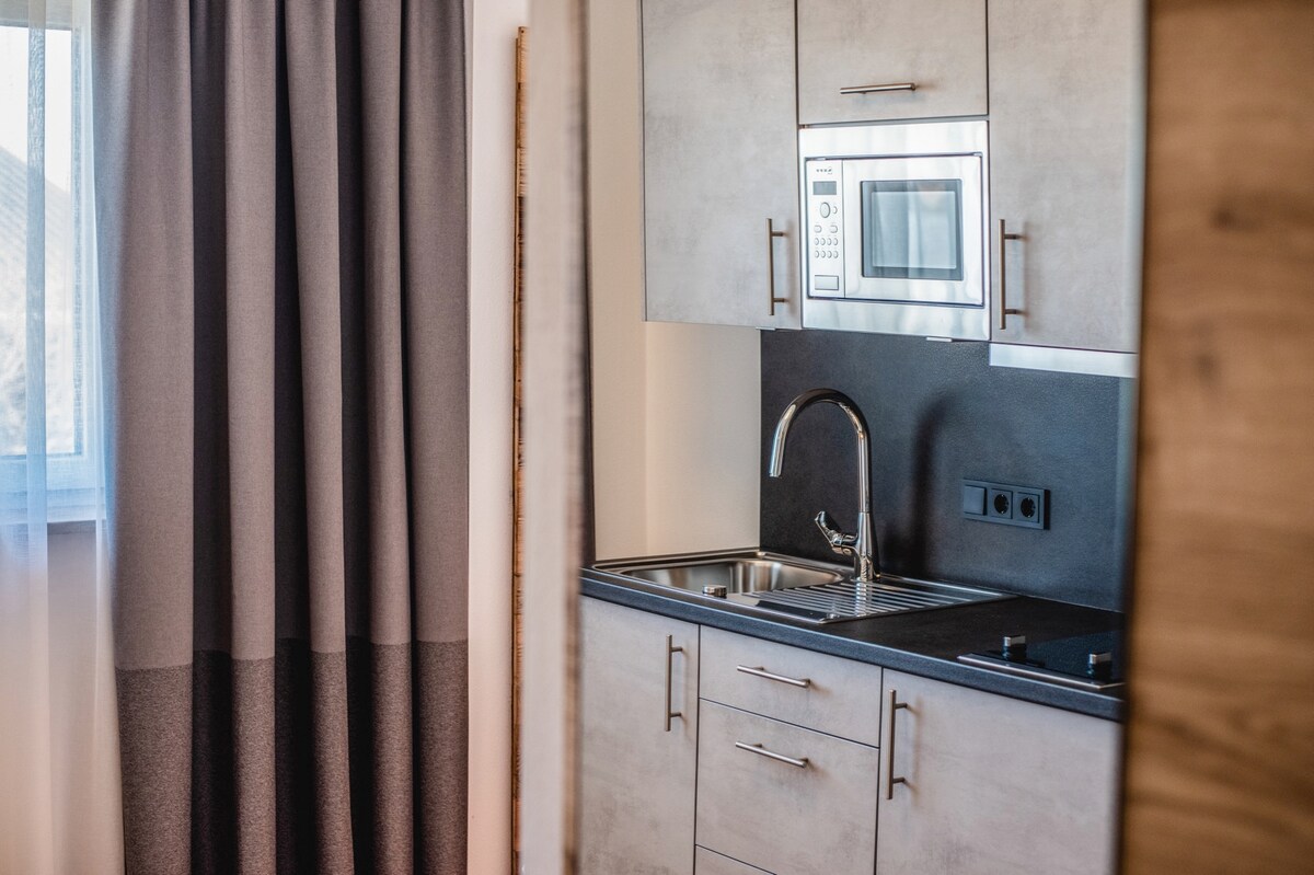 La habitación individual de 24 m² en la 1.ª planta ofrece todo lo necesario para una estancia relajante. Una práctica cocina pequeña y una acogedora zona de estar garantizan comodidad y flexibilidad. El suelo de madera da a la habitación un ambiente cálido, y desde el balcón se puede disfrutar de una maravillosa vista del jardín. El moderno baño está equipado con ducha y WC, ideal para su tiempo libre.