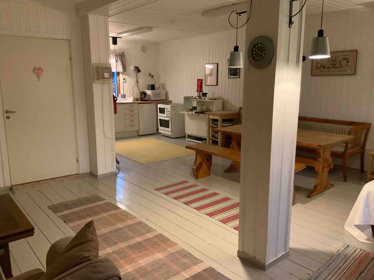 Vives en “Kråkboet”, un granero reconvertido, aislado, en nuestra propiedad. Un apartamento de unos 70 metros cuadrados en un granero, con capacidad para 6 personas, distribuido en 4 literas y una cama doble compartida, cocina, baño con aseo y ducha. Ofrecemos a “Kråkboet” un dispositivo Google Home. Si no quieres usarlo, desconéctalo. :) Sin embargo, es una ayuda invaluable para personas con discapacidad visual.