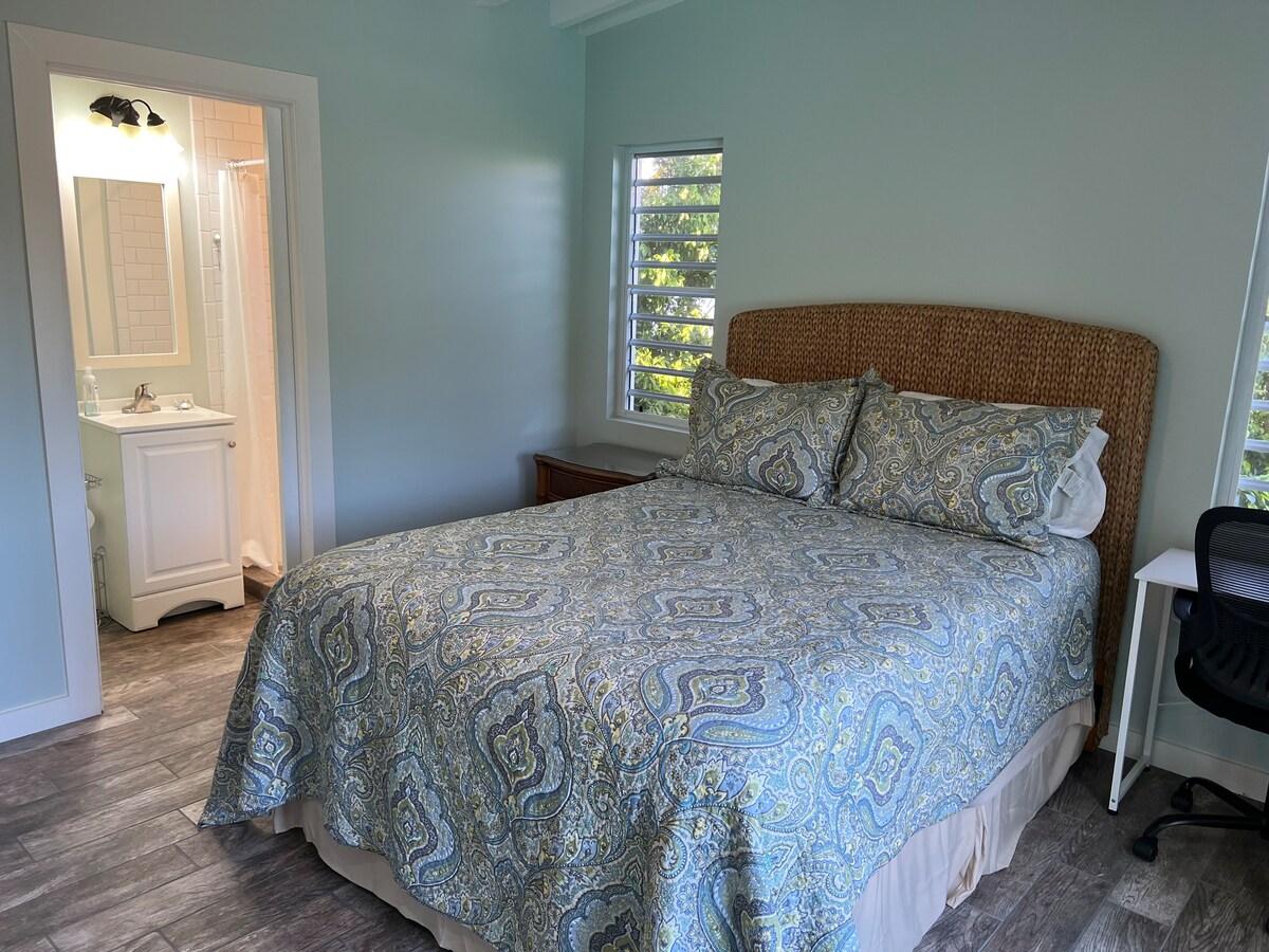 Este estudio de la isla se encuentra en una comunidad cerrada segura, céntrica, cerca de Christiansted. Perfecto para viajeros solos y parejas. Wifi gratuito y Smart TV. Cómoda cama tamaño queen con ventilador de techo. Bonita sala de estar y escritorio de trabajo de tamaño completo. Mesa de comedor para 4 personas. La cocina está totalmente equipada: vitrocerámica, horno de convección/microondas, nevera con congelador, tostadora, cafetera, licuadora, ollas y sartenes, utensilios de cocina. Grifo de agua potable.