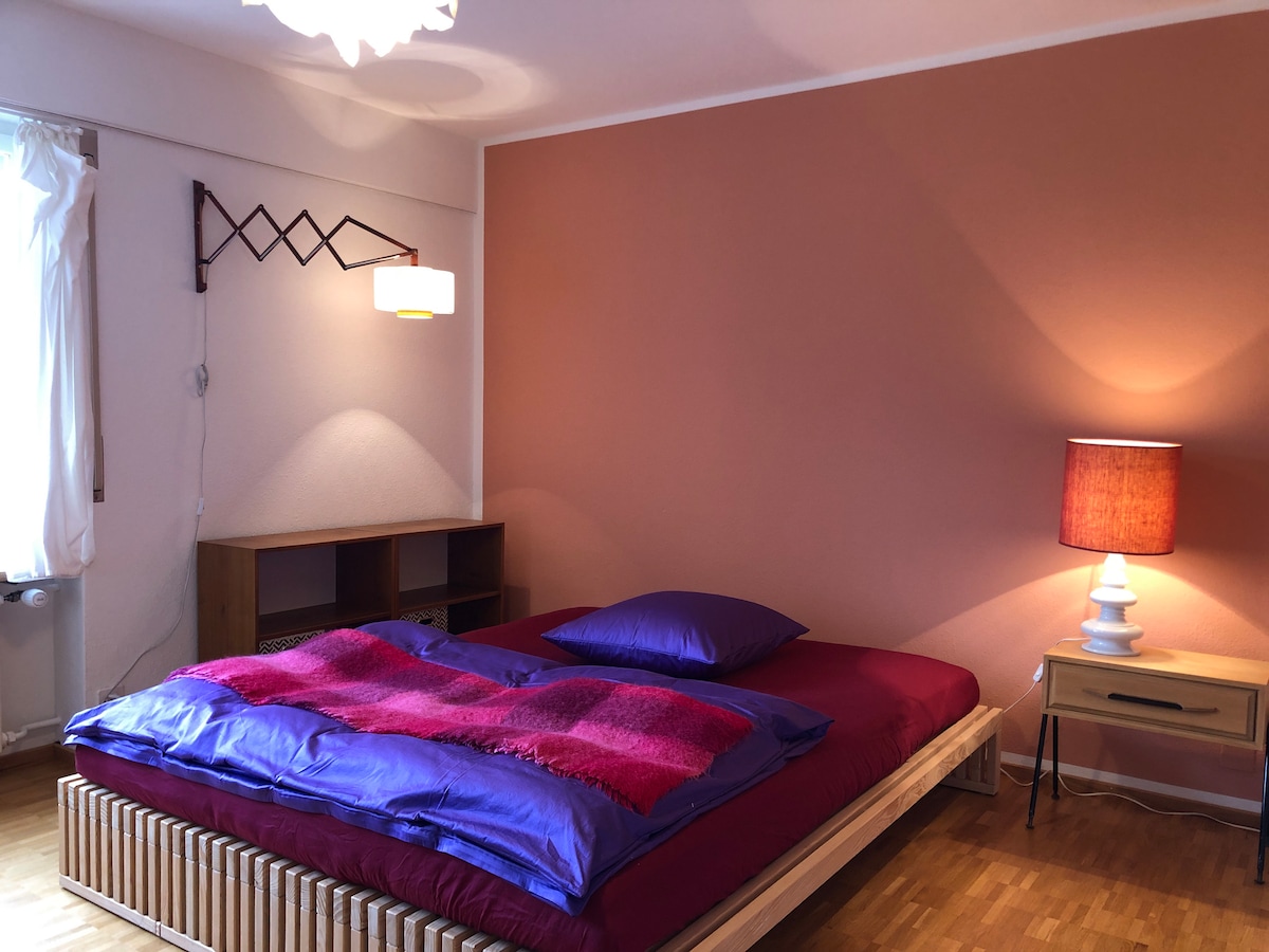 Habitación luminosa y tranquila con baño de estilo años 60 y acceso directo al jardín. Cocina-sala de estar totalmente equipada con nevera propia, compartida con otra habitación. A 5 minutos a pie de Coop & Farm, zona de recreo local frente a la puerta. A 20 minutos en autobús de la ópera, tren directo al aeropuerto.