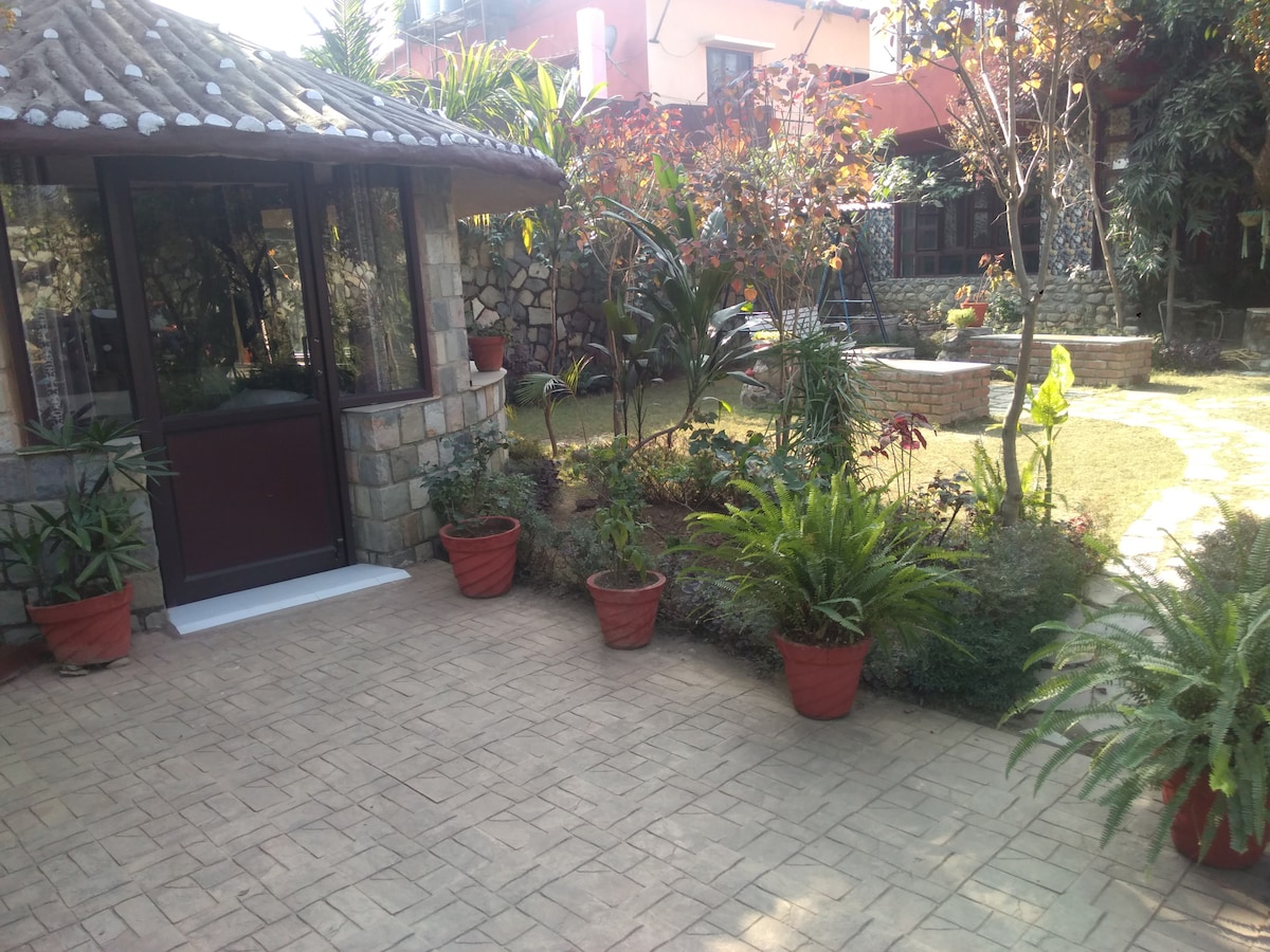 La habitación Hut está bellamente ubicada dentro del jardín con grandes ventanas para disfrutar de esta experiencia de vida en el jardín y una vista palpitante del corazón de Mussoorie Hills. Te encantará despertarte con Chirping of Birds y puedes absorber el aire extremadamente fresco y rico en oxígeno con fragancia de plantas. Mirar a los pájaros en tu habitación y jardín es la belleza de alojarse en esta habitación de las cabañas. Ver el hermoso amanecer desde dentro de las instalaciones y hermoso con vistas a Mussoorie Lightnings por la tarde es el encanto de este lugar.