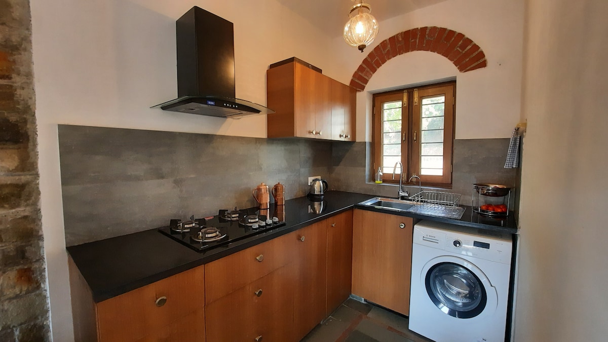 This cosy 1-BHK artistic loft is tucked away in a peaceful residential area near Sahastradhara Waterfalls, offering a world of its own. The patio features potted plants and a swing chair, while a gazebo with a dining table and brick fireplace makes outdoor meals delightful. Inside, the kitchen is fully equipped with modern appliances. Private parking is available. Grocery stores and charming cafés are located within 100–200 meters, and Zomato, Swiggy, and Blinkit deliver right to your doorstep.