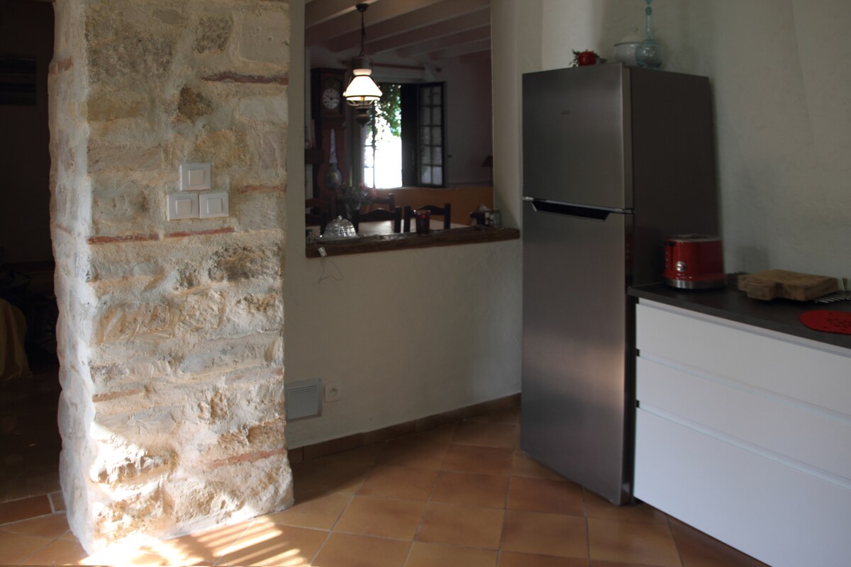 Le gîte : -RDC : Grande pièce de vie avec cuisine équipée ouverte sur espace salle à manger et salon, buanderie, wc indépendant. 1er ETAGE : Palier avec un canapé lit et espace bibliothèque, 1 chambre avec lit 160x200, 1 chambre avec 2 lits en 90x200 ou 1 lit en 180x200, salle d’eau, wc indépendant. A l’extérieur, vous aurez accès à une terrasse privative avec salon de jardin, espace repas et barbecue. La piscine est à partager avec les propriétaires.