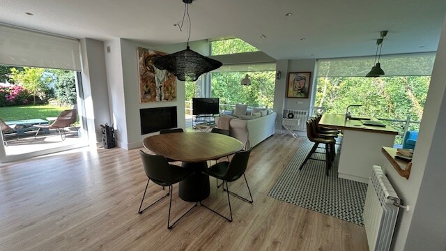 Vivienda exclusiva de 100m2. Espacio acogedor, cómodo e impecable con un interiorismo muy cuidado, optimizando la funcionalidad y la estética tanto en mobiliario como en materiales e iluminación. Dispone de grandes ventanales lo que permite la entrada de mucha luz natural y vistas panorámicas a la finca. Está equipada con todo lo necesario para seis huéspedes. Está rodeada de jardín de unos 300 m2 delimitados con un cierre de hayas en crecimiento y dotada de piscina con agua de manantial.