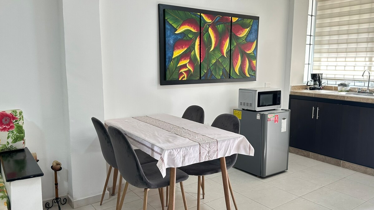 Es un lugar muy bonito bien ubicado y cómodo. La habitación Principal tiene aire acondicionado, TV con cable y Sonido, es muy confortable. Tiene un baño impecable y muy higiénico, está central y muy cerca de centro comercial, mercado, bancos y centro de la ciudad