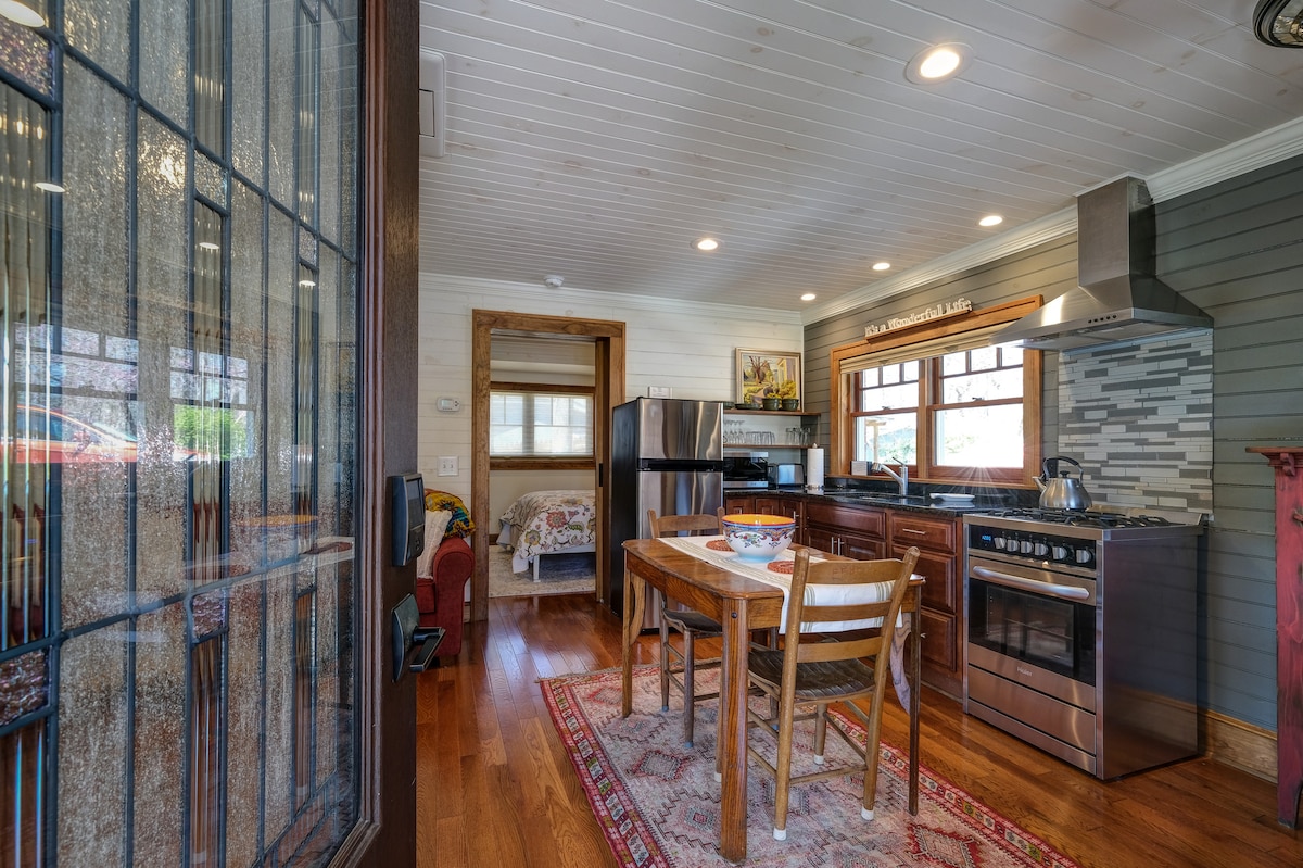 Una estancia privada tranquila y artística con jacuzzi, accesible al centro de Murphy y a todas sus atracciones artísticas y gastronómicas. A minutos de John C. Campbell Folk School (¡y bailes!) y Brasstown y Blue Ridge. Hay aparcamiento adicional disponible. No admitimos mascotas. Estamos orgullosos de nuestro jacuzzi y sala de estar extremadamente limpios. Aparcamiento accesible con rampa y amplias distancias en el porche y planta abierta en el interior.