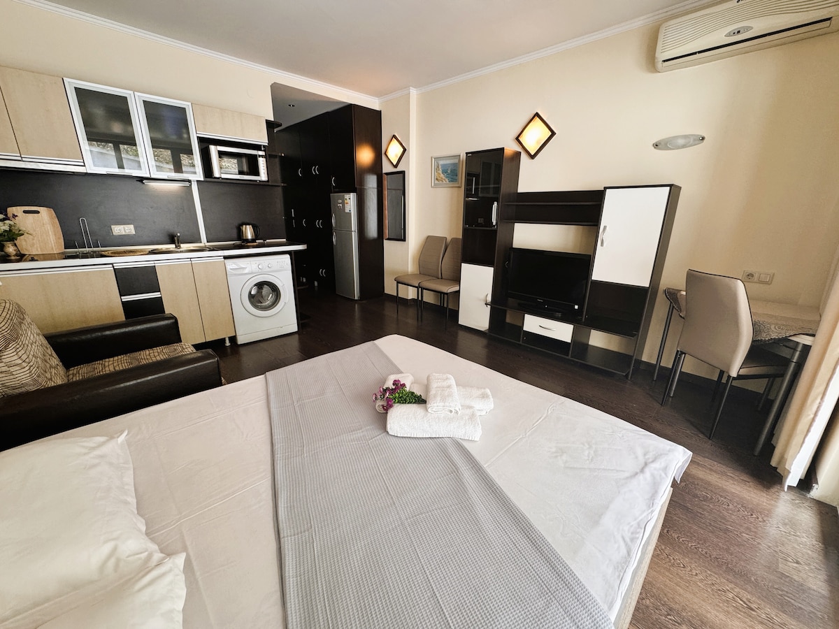 SUNNY STUDIO Azur es un estudio de lujo amueblado en el complejo PREMIUM Thenewest Azur en St. Konstantin y Elena. Un parque maravillosamente ajardinado, junto al mar. El apartamento tiene una cocina totalmente equipada con electrodomésticos, horno, vitrocerámica, lavavajillas, cafetera, nevera y utensilios necesarios, así como una lavadora con secadora. Tiene una cama tamaño king y un sofá cama. Nuestros huéspedes tendrán acceso a una piscina gratuita con tumbonas y sombrillas.