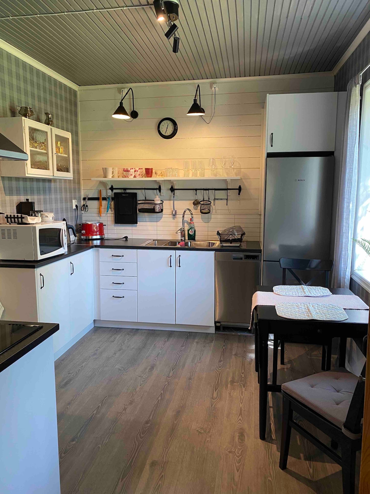 La casa está totalmente equipada, bellamente decorada y tiene un ambiente tranquilo. En la parte antigua, paredes de madera visibles. Varias de las habitaciones tienen vistas al lago. La casa tiene 130 metros cuadrados; cocina, baño con suelo radiante y bonita ducha. 4 hermosos dormitorios y amplio salón con chimenea. Patio con mesa y sillas, zona de barbacoa con vistas al lago y cama elástica para niños en verano. En el lago, hay una sauna de leña para alquilar y un bote de remos para pedir prestado. Se pueden alquilar sábanas y toallas. Se puede reservar la limpieza. También se puede alquilar una casa de campo para 2 personas.