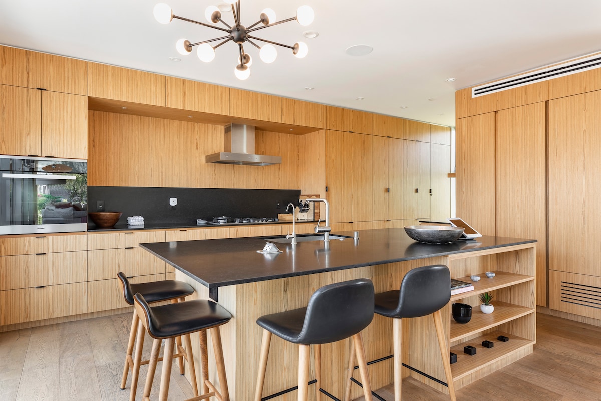 La casa se encuentra bellamente en el cañón, su sensación orgánica y, sin embargo, su diseño moderno trasciende la idea de la vida en California al combinar el interior/exterior a través de enormes ventanas, techos de alturas increíbles e impresionantes vistas. Ubicada en el cañón, pero a solo 5 minutos de la ciudad de Topanga con sus tiendas y restaurantes y a 10 minutos de la playa. Ahora puedes disfrutar de nuestro nuevo jacuzzi de madera de cedro después de una relajante sesión de yoga en el estudio. Aparece en el NYTimes, Dwell, Vogue...