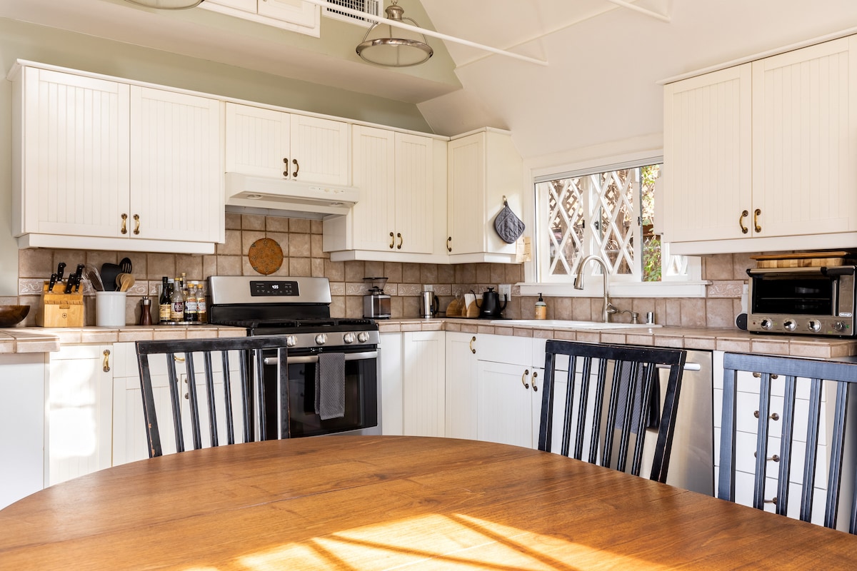 ¡Nuestra casa de campo de 1926 es un refugio zen secreto! Se encuentra en las colinas debajo de Topanga y rodeada de sonidos de la naturaleza y preciosas vistas. ¡Cada huésped parece encontrar un lugar del que enamorarse! El refugio ofrece una espaciosa terraza iluminada de estilo cafetería con vistas increíbles, un jardín suculento, una hermosa terraza fuera de la suite principal con amplias vistas, un estudio relajante para leer y un tranquilo loft de estilo meditación. La cocina recién reformada crea una experiencia culinaria increíble. A pocos pasos de rutas de senderismo y a minutos de PCH.