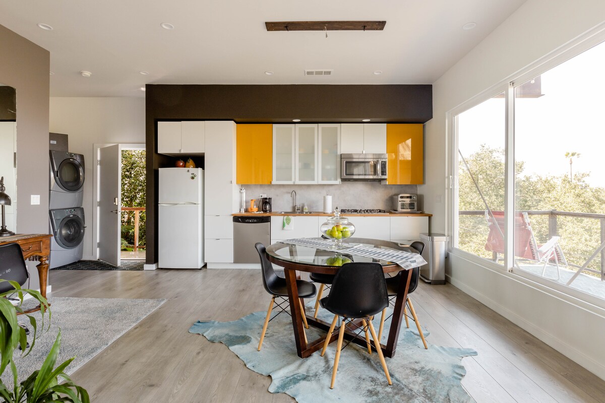 Loft de un dormitorio elegantemente diseñado en las colinas al sur de Ventura Boulevard con impresionantes vistas y privacidad. Cocina y baño modernos a estrenar. Apartamento de un dormitorio con cama tamaño queen (en el dormitorio) y un sofá cama en la sala de estar. Tiene capacidad para 2-3 personas. Adecuado para familias. No hay ascensor, unos 20 escalones fáciles hasta la suite. Fácil aparcamiento gratuito en la calle. A 10 minutos a pie del famoso Ventura Blvd, excelentes restaurantes y tiendas, el estudio Millenium Dance está a 10 minutos.