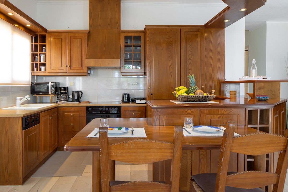 Es un apartamento de 85 metros cuadrados con vistas notables y diseño moderno en un entorno donde el único ruido son los pájaros del bosque. Queremos informarte de que nuestro apartamento NO TIENE AIRE ACONDICIONADO ni electrodomésticos de bajo consumo. Hay aparcamiento a 10 metros de distancia. A 15 minutos a pie se encuentra el supermercado Lidl y hay un minimercado a 300 metros de distancia. Además, el famoso Caffe Koukouvaya está a 10 minutos a pie.