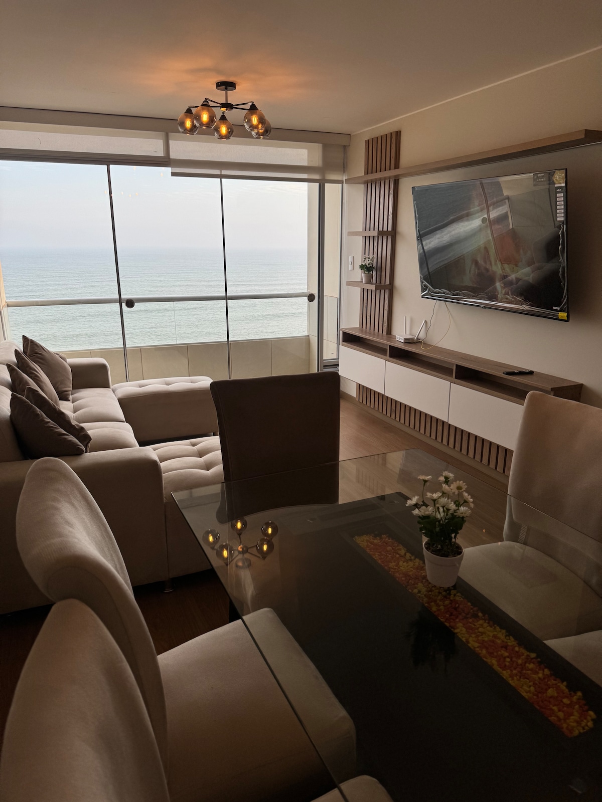 Disfruta de tu estadía en Lima despertándote frente al mar🌞🌊, alojándote en este moderno, limpio, seguro y hermoso departamento ubicado cerca de las zonas turísticas y a sólo 20 minutos del aeropuerto✈️! El edificio cuenta con increíbles áreas sociales en el último piso, incluida una gran piscina para adultos con vista al mar, piscina y juegos para niños, gimnasio, sala de juegos, cine, sauna y además seguridad privada las 24 horas. Cuenta con Aisladores Sísmicos! (hasta 80% reducción)