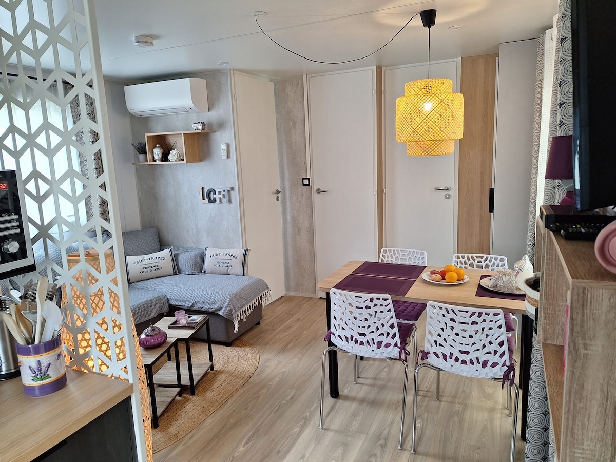 Le encantará esta escapada única y romántica. Chalet de 20 m2 con jardín privado y aparcamiento, calefacción y aire acondicionado reversible, suelo radiante. Sofá cama de 2 plazas de tamaño estándar 140 cm tipo clic clac muy cómodo colchón grueso + 1 sillón que se despliega en cama supletoria una plaza para un niño o adulto ocasional. Baño e inodoro separados, cocina equipada, TV, wifi, Ok Googl aire acondicionado, ventilador... ¡Cerca de todas las comodidades!