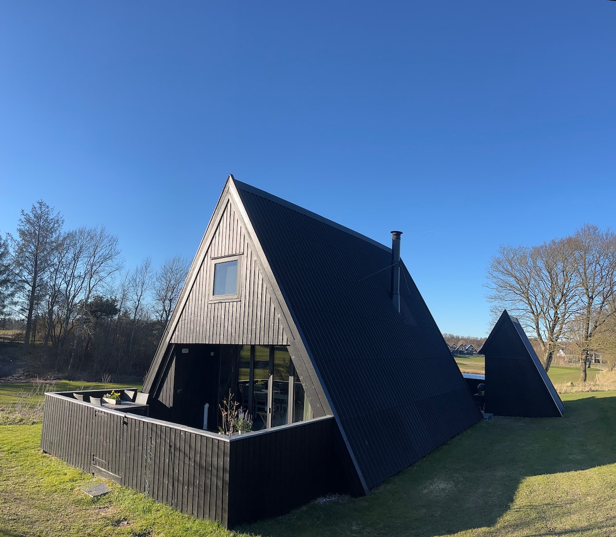 Hermosa A-House en la encantadora HimmerLand. La casa está en una zona tranquila con una maravillosa vista del hoyo 12 en el "viejo campo" - HimmerLand ofrece 2 campos de golf de 18 hoyos y muchas otras instalaciones de ocio. La casa tiene una bonita terraza con vistas al lago y al agujero 12. Hay edredones nuevos y almohadas para dormir y cada inquilino está completamente limpio. Hay una barbacoa y muebles de jardín en la terraza. Lavajillas y nevera con pequeño congelador.