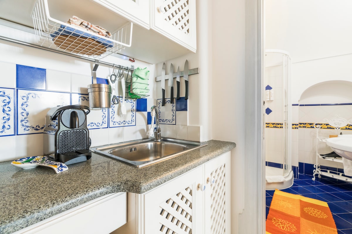Blu es una acogedora suite independiente perteneciente a la residencia recién inaugurada Pezz Pezz, en la ciudad de Praiano. El mobiliario original de la suite sintetiza completamente la modernidad y la tradición de la costa de Amalfi y hace de Blu el lugar perfecto para recién casados y parejas jóvenes. Cuenta con una entrada independiente y una terraza equipada con jacuzzi privado y tumbonas, perfecta para relajarse después de un ajetreado día por la costa y disfrutar del sol mientras se pone detrás de las pilas de Capri (Faraglioni).