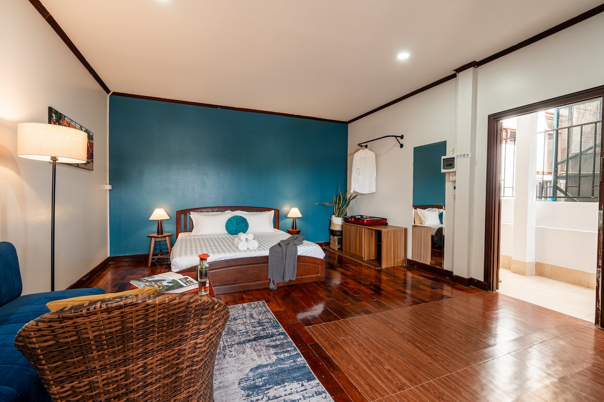 Tucked away on a quiet street, BlueHome offers a peaceful retreat perfect for families or group of friends. Our spacious, thoughtfully designed rooms let everyone relax — whether you’re unwinding after exploring the city or sharing moments together. Whether you’re heading from Pakse, Thakhek to Vang Vieng, Luang Prabang or Thai Embassy, make BlueHome your easy, comfortable stop to relax, reset & feel home. Central: restaurant, cafes, temples, Night Markets, Mekong are a 2 min walk away.
