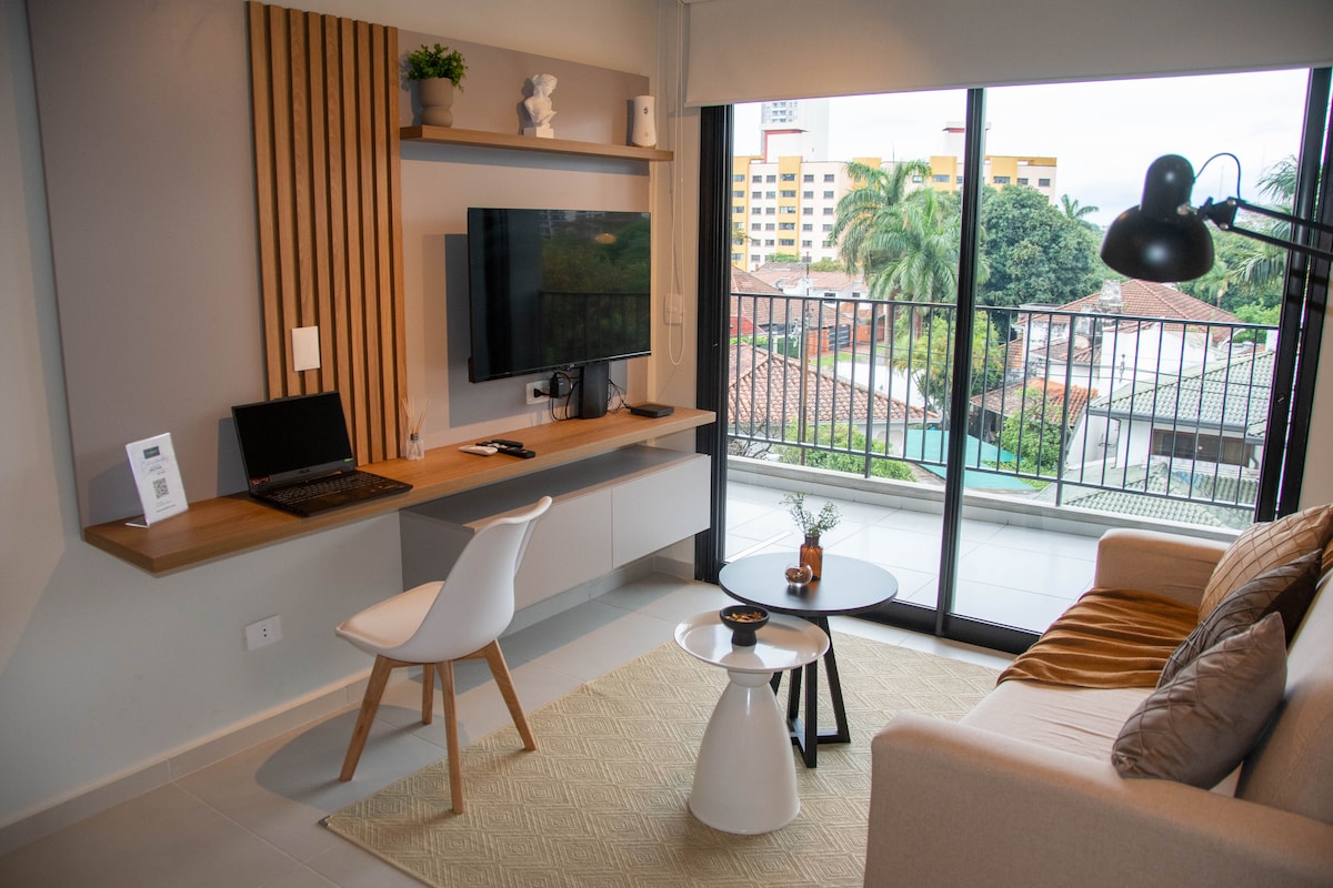 Departamento moderno, súper equipado, con balcón, parrilla, vista panorámica desde el piso 24 y excelentes servicios: - Piscina - Coworking - Quincho - Cine - Estacionamiento por autoelevador (auto pequeño/mediano) - Seguridad 24/7 Gran ubicación: - A 5 minutos del Eje Corporativo, el Shopping del Sol y el Paseo La Galería. - A 10 minutos de la Costanera y el Puente Héroes del Chaco. - A 15 minutos del Aeropuerto Internacional Silvio Pettirossi. Incluye Wi-Fi · Smart TV · Colchones premium